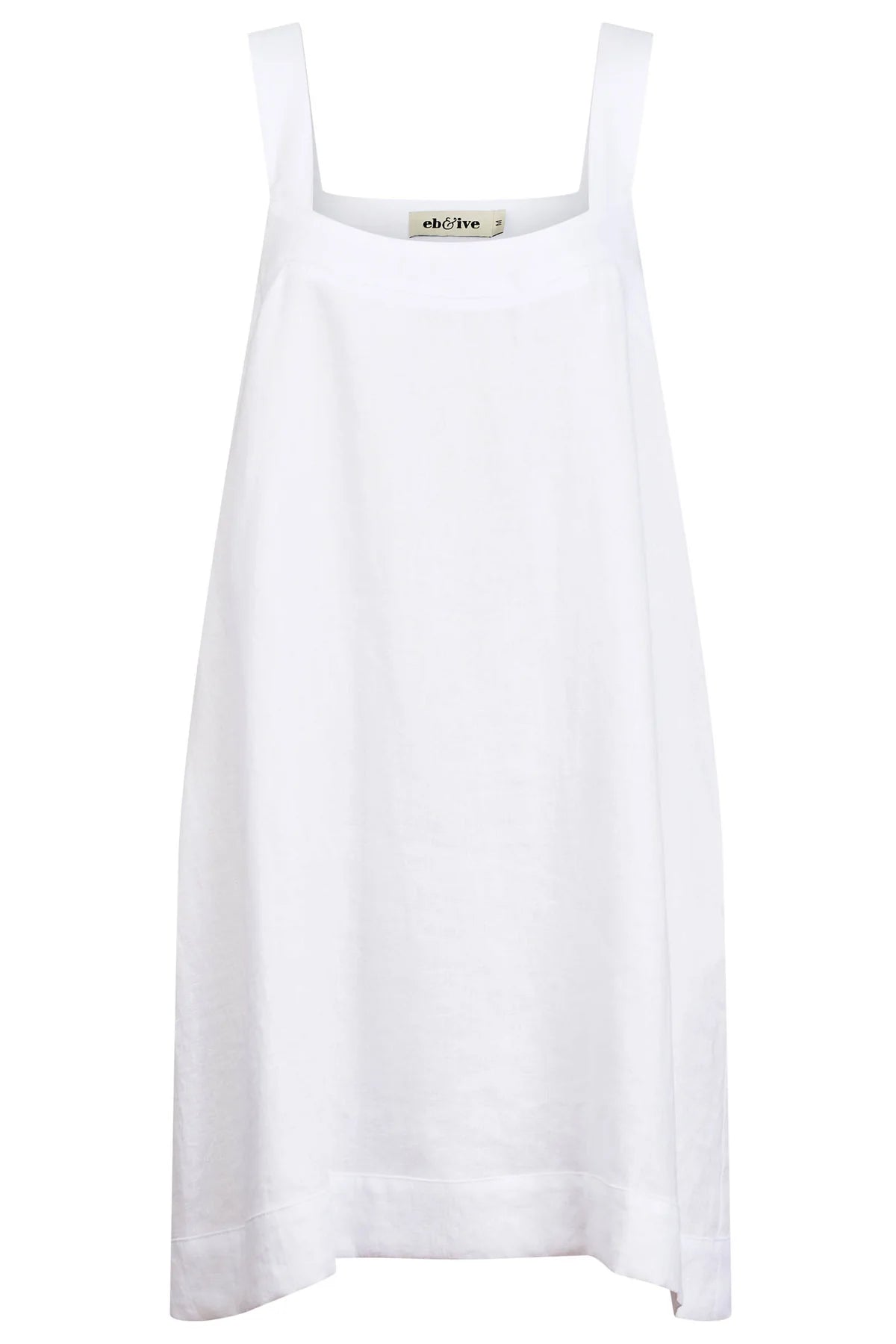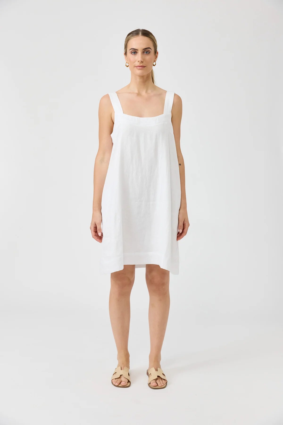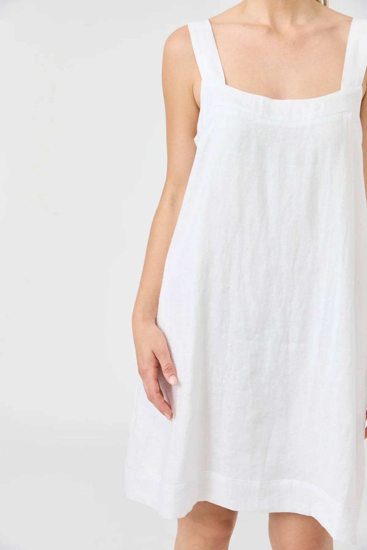 Crafted from 100% linen for breathable, lightweight comfort. Designed with a square neckline, wide shoulder straps, and a relaxed silhouette that falls to the knee. Features functional side pockets and is fully lined in white for ease of wear. True to size fit for an effortless feel.